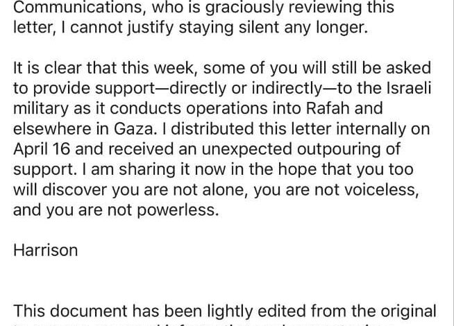 🇺🇸الضابط في وكالة استخبارات الدفاع التابعة للبنتاغون الميجور هاريسون مان يعلن انه استقال من منصبه مطلع نوفمبر الماضي احتجاجاً على الدعم الاميركي لحرب إسرائيل على قطاع غزة. الضابط قال في رسالة سبق ان وزعها على زملائه في أبريل الماضي وقام ينشرها اليوم انه لا يستطيع ان يدعم سياسة "تمكّن التجويع على نطاق واسع للأطفال" في إشارة إلى الأطفال الفلسطينين. هذه اول استقالة من نوعها في صفوف القوات الاميركية يتم الإعلان عنها احتجاجاً على الحرب.