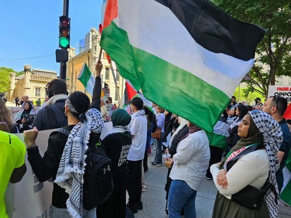 تظاهر مئات النشطاء وأعضاء المنظمات الحقوقية والقانونية الأميركية وسط مدينة شيكاغو بولاية إلينوي مطالبين بوقف الإبادة الجماعية المستمرة في قطاع غزة.