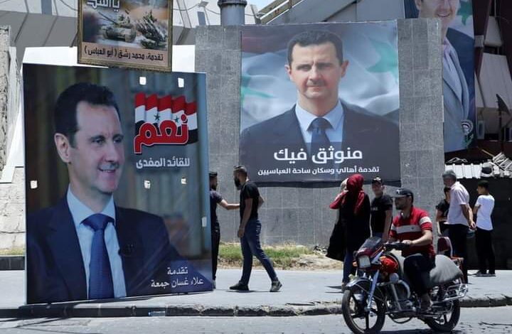 أشخاص يسيرون قرب ملصقات دعائية للأسد في دمشق يوم 22 مايو ايار 2021. تصوير رويترز.