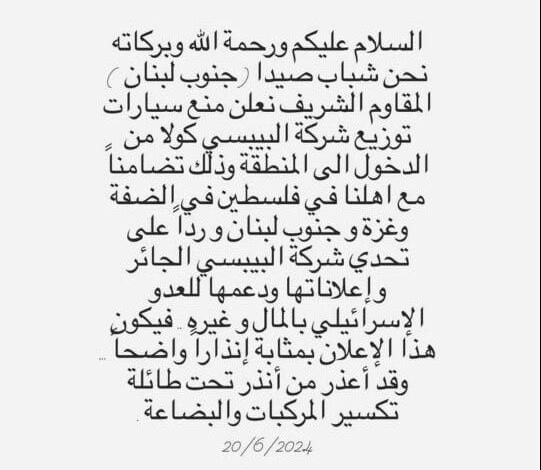 الرئيسية/أخبار لبنان/بيان صادر عن اهالي صيدا ومخيمات الجنوب حول منع دخول اي شاحنة تابعة لشركة ببسي أخبار لبنان بيان صادر عن اهالي صيدا ومخيمات الجنوب حول منع دخول اي شاحنة تابعة لشركة ببسي Rasha Haidarيونيو 21, 20240 41 أقل من دقيقة معجب بهذه:إعجاب تحميل... الوسومببسي مخيمات الجنوب مقاطعة Rasha Haidarيونيو 21, 20240 41 أقل من دقيقة فيسبوك X واتساب مشاركة عبر البريد طباعة