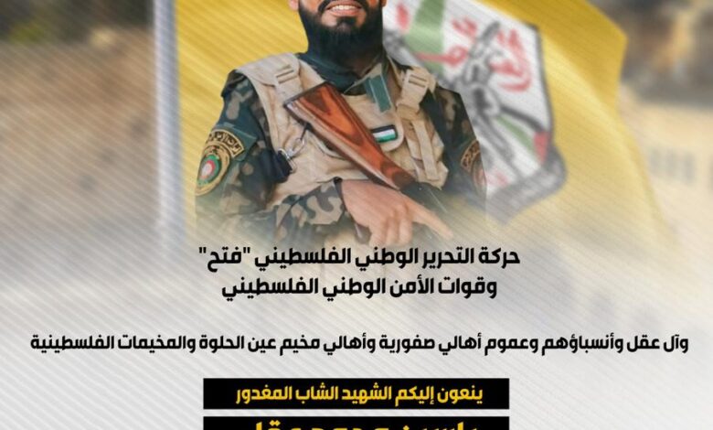 سيصلى على جثمانه الطاهر يوم الأربعاء ٢٦/٦/٢٠٢٤ بعد صلاة العصر في مسجد السلطان صلاح الدين في عين الحلوة