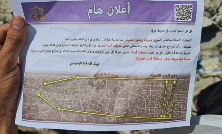 وحددت المناشير الموجهة إلى”كل المتواجدين في مدينة غزة” باللغة العربية طرقا آمنة رسمت عليها أسهم تشير الى طرق وممرات الخروج من المدينة نحوالجنوب.