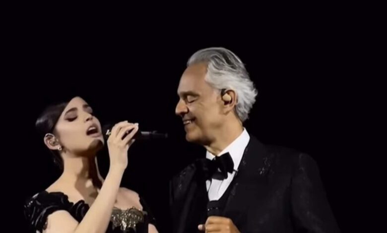 إبداع إيلي صعب على مسرح توسكانا مع أندريا بوتشيللي… فستان خلّاب بالأسود والذهبي (صور)
