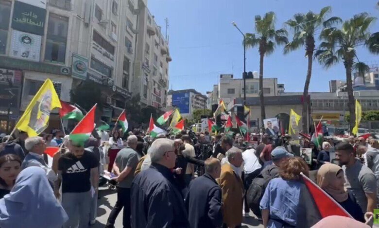 وجابت مسيرة حاشدة شوارع مدينة رام الله، وردد المشاركون في المسيرة هتافات تدعو إلى “وقف عدوان الاحتلال على قطاع غزة والضفة، ومحاسبة الاحتلال على جرائمه التي يرتكبها بحق أبناء الشعب الفلسطيني”.