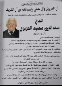 وختمت:”نعزي عائلة الفقيد الكبير ونعزي أنفسنا ورابطة آل الحريري وأنسبائهم من آل الشريف برحيله . رحم الله العم أبو محمود وأسكنه فسيح جنانه وألهمنا واياهم الصبر والسلوان”.