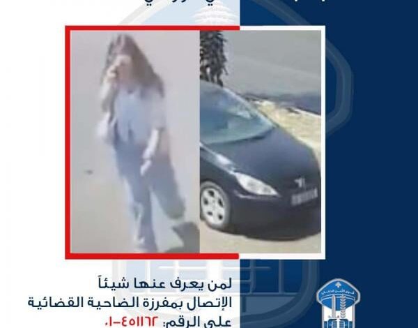 أعلنت المديرية العامة لقوى الامن الداخلي ـ شعبة العلاقات العامة أنه إلحاقًا لبلاغنا المُتعلّق بتعميم صورة سيارة نوع “بيجو” طراز: /307/CC، لون /أسود/، تحمل لوحة رقم 637872/ج، تقودها سيّدة أقدمت بتاريخ 7-8-2024 على صدم أحد المواطنين في محلة الأوزاعي، وفرّت إلى جهة مجهولة،وكونه لم يتمّ تحديد هوية مالك السيّارة الحالي حتّى الآن، بسبب بيعها من دون تنظيم “وكالة بيع” لدى المراجع القانونيّة:
