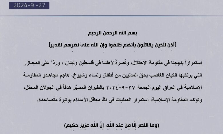 بيان صادر عن المقاومة الاسلامية في العراق :