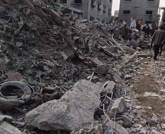 صورة تظهر الدمار الذي أحدثه قصف الإحتلال على مربع سكني بجوار مسجد الطلاع في النصيرات وسط قطاع غزة فجر اليوم.