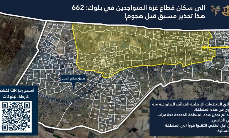وجّه المتحدث باسم الجيش الإسرائيليّ أفيخاي أدرعي إلى سكان قطاع غزة، في البلوك 662 (منطقة النصيرات) تحذيرًا مسبقًا قبل هجوم.