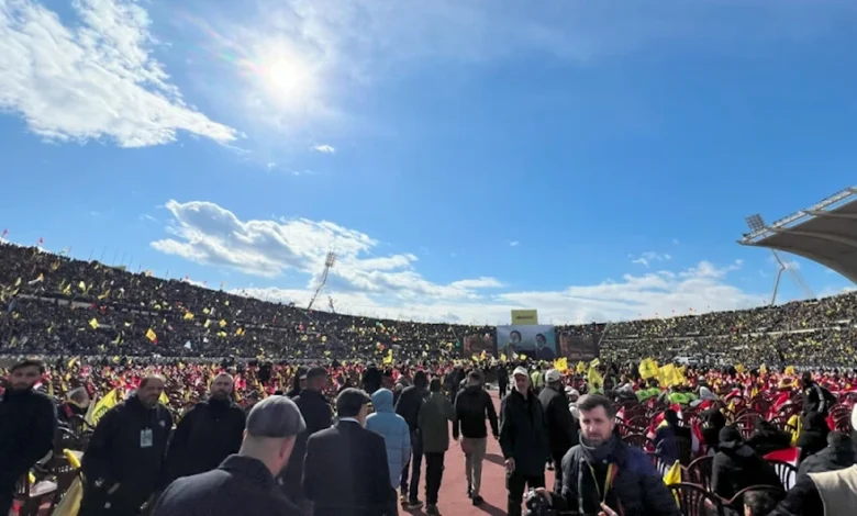 حشود ضخمة امتلأت المدينة الرياضية وشوارع بيروت والمناطق المجاورة، وضمت محبي السيدين من لبنان والعراق وإيران واليمن وتونس وغيرها من الدول. جرت المراسم وسط تدابير أمنية مشددة، وحضور رسمي من قبل رئيس مجلس النواب نبيه بري، ممثلًا رئيس الجمهورية جوزاف عون، ووزير العمل محمد حيدر، ممثلًا رئيس الحكومة نواف سلام. بدأت المراسم بتلاوة آيات من القرآن الكريم، ثم النشيد الوطني اللبناني ونشيد حزب الله. بعدها ألقى ممثل المرشد الإيراني السيد علي الخامنئي، مجتبى الحسيني، كلمة أكد فيها استمرار المقاومة ومواجهة الاستكبار حتى تحقيق الأهداف المنشودة، موضحًا أن “الروح ونهج السيدين ستستمر وتتنور شموخًا في تاريخ المنطقة”.