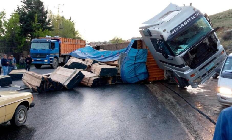 انقلاب شاحنة مع حمولتها على طريق ضهر البيدر – المريجات ادى الى تسرب المازوت وازدحام مروري