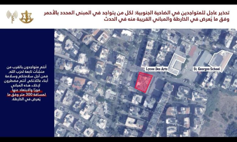 وجه الناطق باسم جيش العدو أفيخاي أدرعي انذارًا عاجلًا للمتواجدين في الضاحية الجنوبية في بيروت وبخاصة في حي الحدث بضرورة الاخلاء.