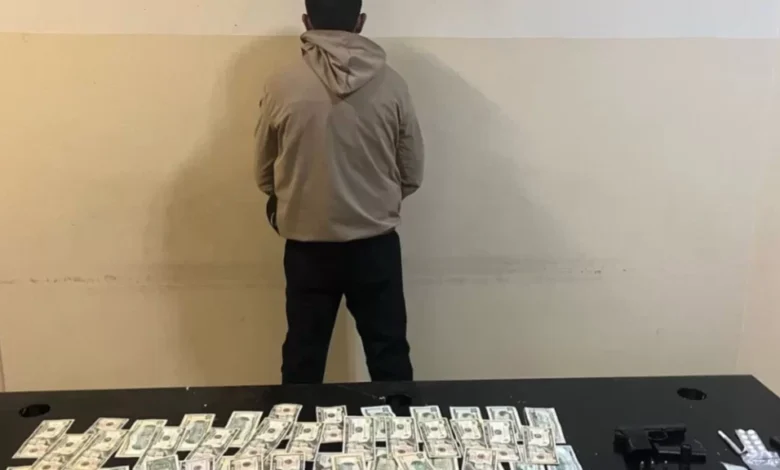 كما ضبط بحوزته سلاح حربي ومواد مخدرة ومبالغ مالية.