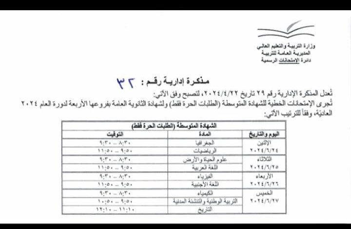 اصدرت وزارة التربية والتعليم العالي مذكرة ادارية اعلنت فيها مواعيد الامتحانات الخطية للشهادة المتوسطة (الطلبات الحرة) ولشهادة الثانوية العامة بفروعها الاربعة وجاءت على الشكل التالي: