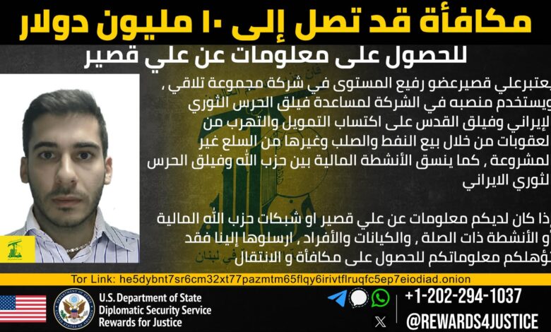 أعلن برنامج “مكافآت من أجل العدالة” الأميركي عن مكافأة تصل إلى 10 ملايين دولار مقابل معلومات تؤدي إلى تعطيل الأنشطة المالية لحزب الله، مشيرًا تحديدًا إلى علي قصير، أحد أبرز ممولي الحزب و”فيلق القدس” الإيراني.